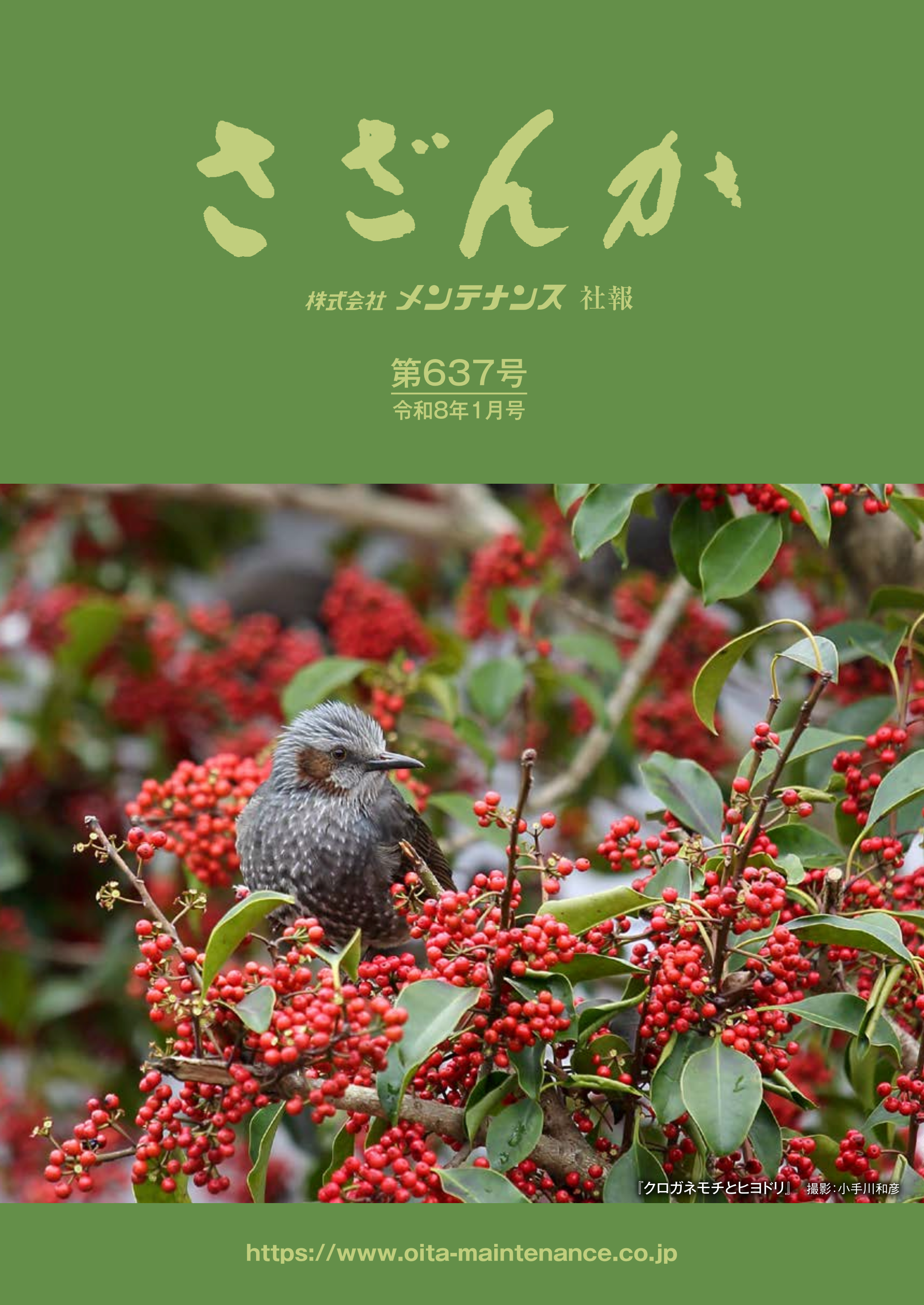 令和8年1月637号 クロガネモチとヒヨドリ 新年のご挨拶 マナーアップ『姿勢を正して、爽やかなスタート』 おしえて!キットソン 人物紹介『設備本部 田村さん』 安心安全ニュース イベント情報 総務だより『最低賃金アップ』 クリーンスタッフ募集 趣味投稿『唐辛子みそ』 PDFダウンロード